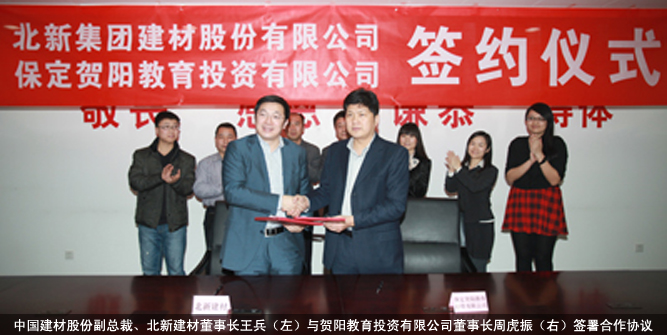 1月28日,北新建材与贺阳教育投资有限公司合作备忘录签约仪式在北京举行。中国建材股份副总裁、北新建材董事长王兵和贺阳教育投资有限公司董事长周虎振分别代表双方签署了《就业实习基地共建合作备忘录》。