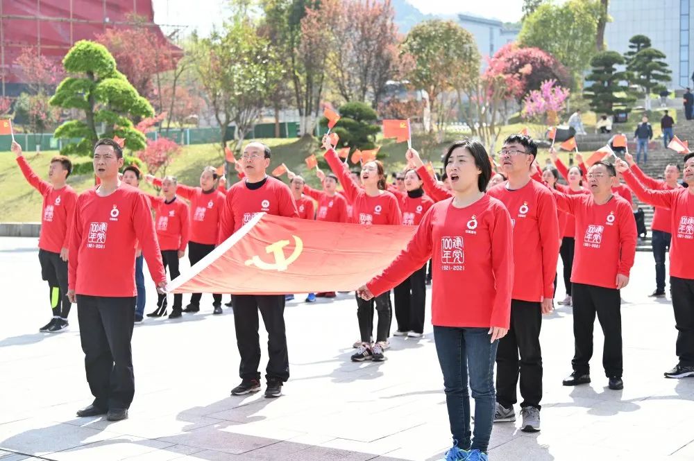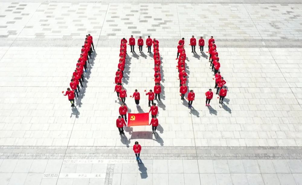 71名同志到达秋收起义广场后,迅速有序排成“100”字型,挥舞着党旗,高喊“爱我祖国、爱我中国建材”口号,高唱《没有共产党就没有新中国》《歌唱祖国》庆祝中国共产党成立100周年。