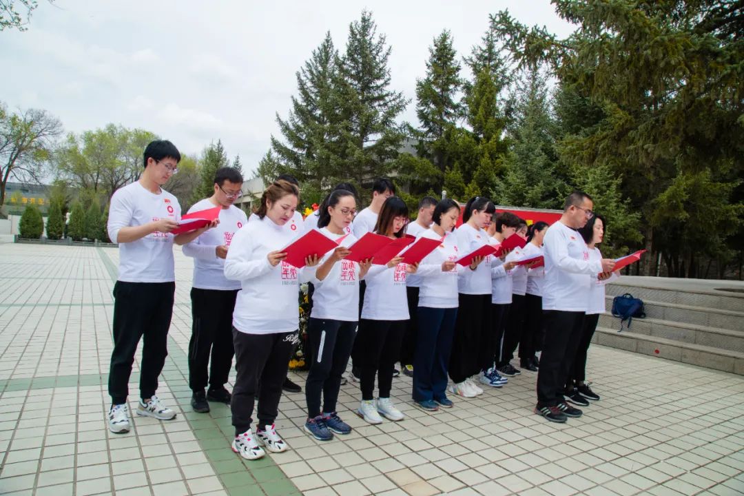 21名同志集体朗诵《党的赞歌》,饱含深情的语言在苍松翠柏间回荡。