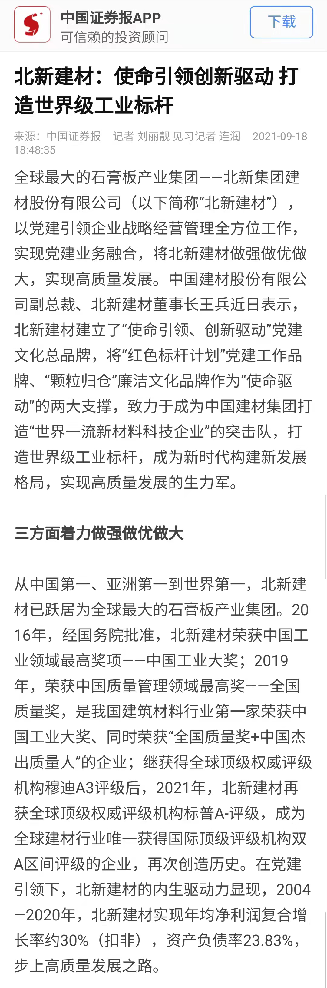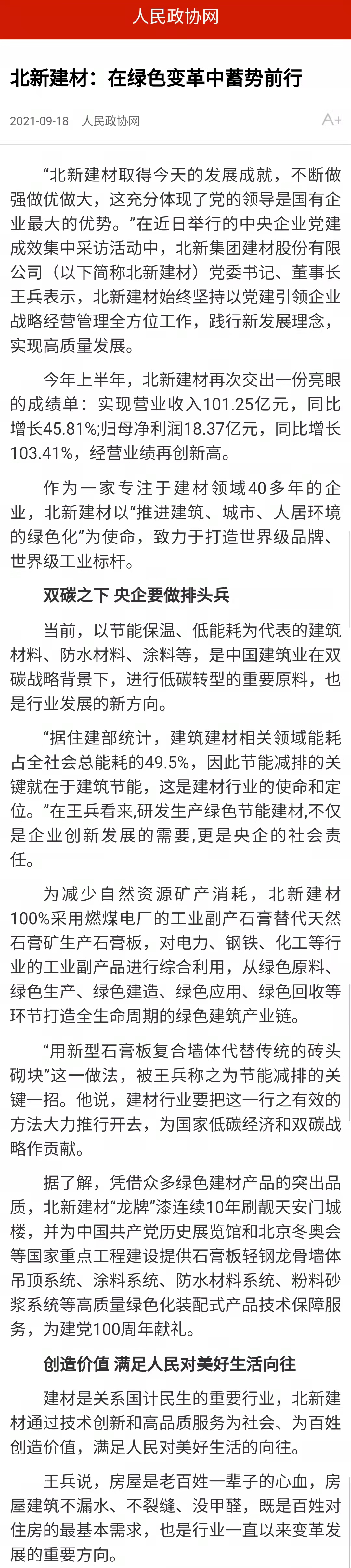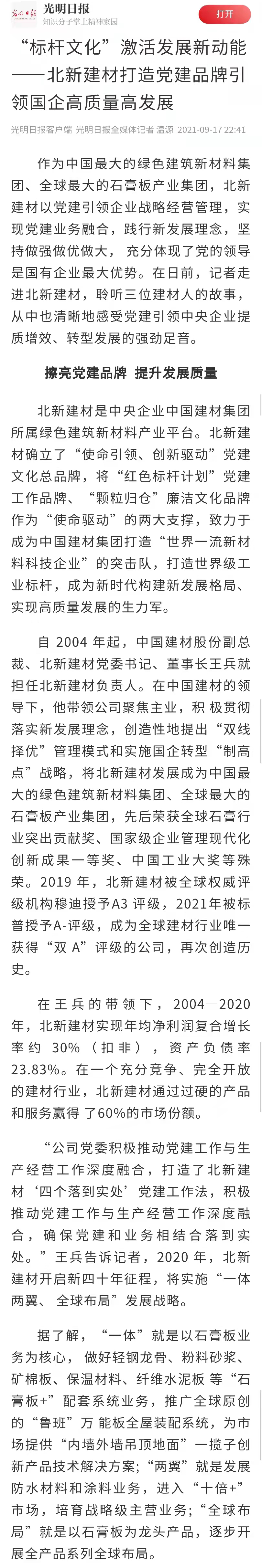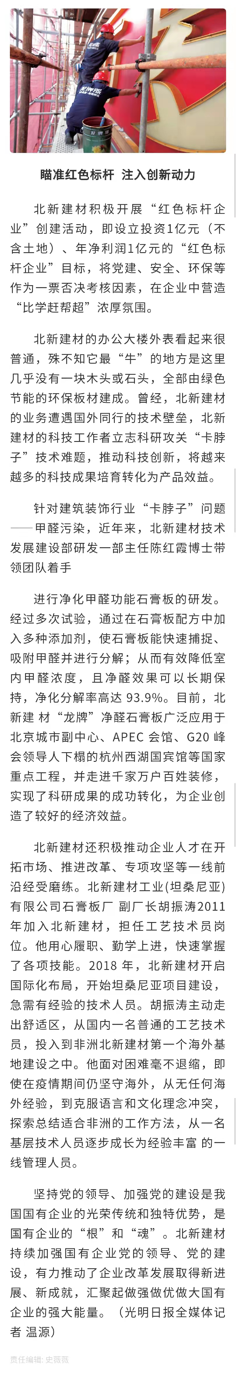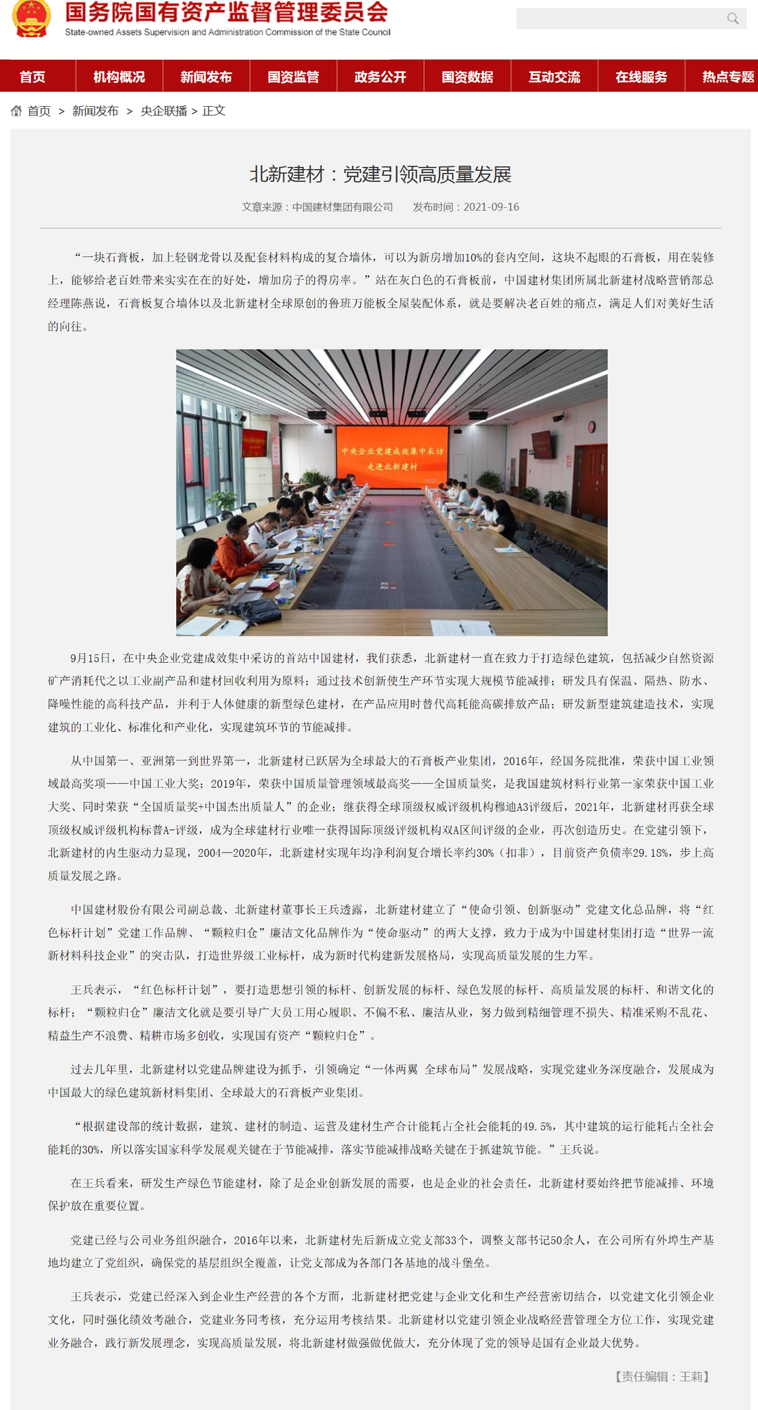 来源:国资委官方网站、光明日报、工人日报、人民政协网、中国证券报、每日经济新闻、北新建材发布时间:2021-10-09在全国国有企业 工作会议召开五周年之际,国资委新闻中心联合人民网等平台组织的“对话新国企·党建大家谈”系列融媒体访谈上线,访谈中多位中央企业党建工作负责人共话国企党建新局面, 党委书记、董事长周育先受邀参加访谈,讲述党建引领化解重组难题、创新打法走上发展快车道。同时,集团所属北新建材作为“中央企业党建成效媒体集中采访”活动首站已完成访谈报道,充分说明 走在高质量党建引领高质量发展的前端。