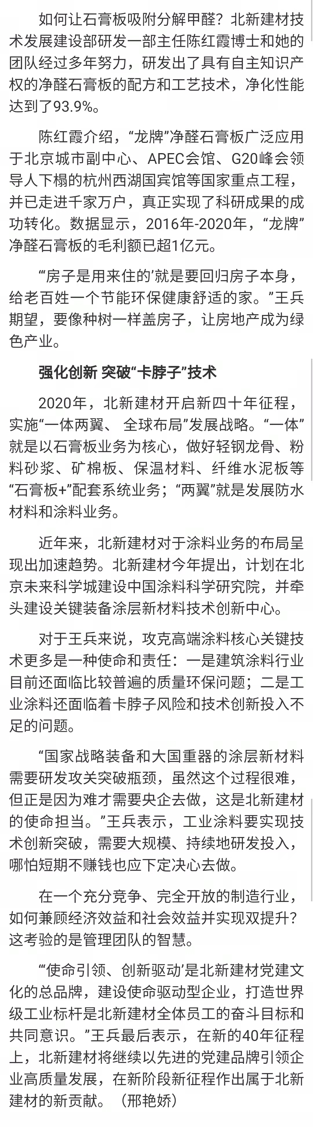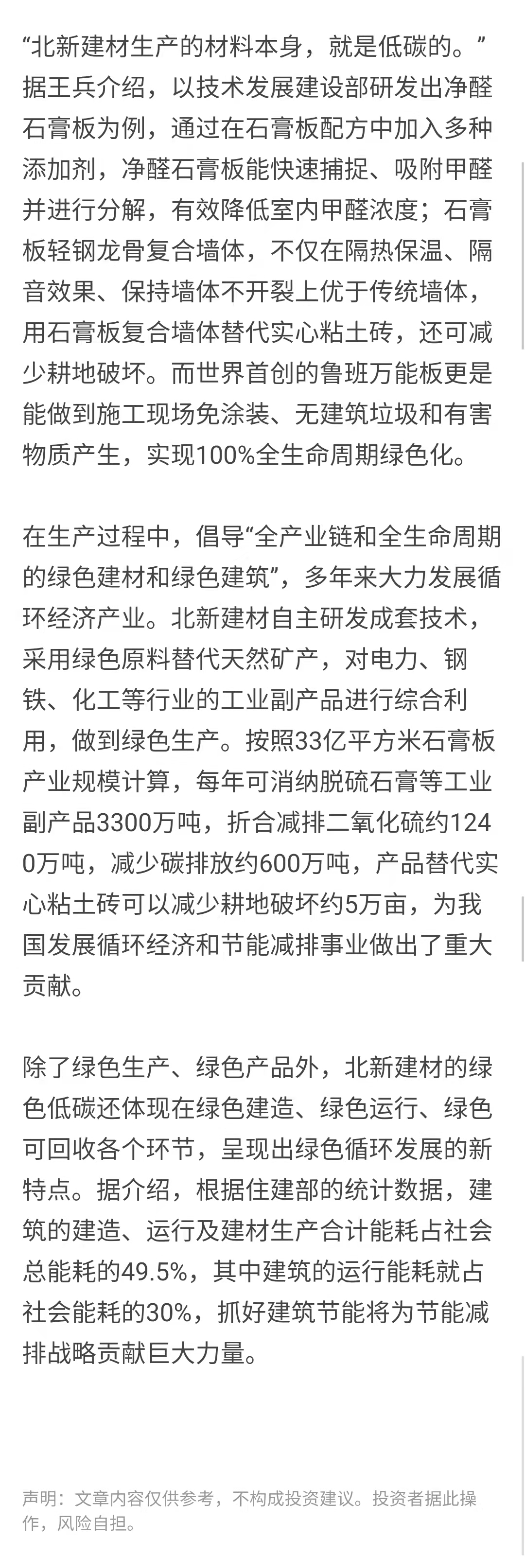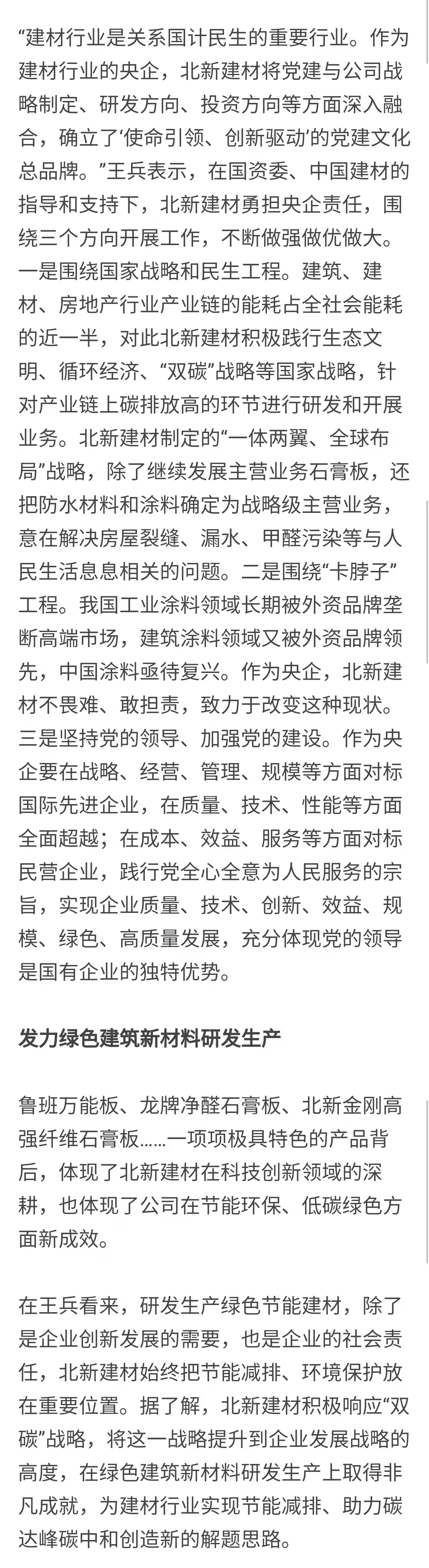 一是围绕国家战略和民生工程。建筑、建材、房地产行业产业链的能耗占全社会能耗的近一半,对此北新建材遵循 “善用资源 服务建设”理念,积极践行生态文明、循环经济、“双碳”战略等国家战略,针对产业链上碳排放高的环节进行研发和开展业务。围绕人民对美好生活的向往,北新建材实施“一体两翼、全球布局”发展战略,除了巩固主营业务石膏板,还发展防水材料和涂料两个业务领域,为与人民生活息息相关的房屋裂缝、漏水、甲醛污染等问题提供解决方案。