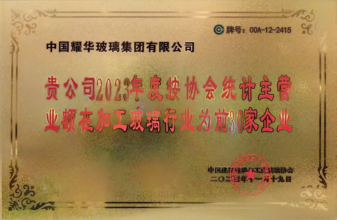 耀华玻璃深加工荣获“2023年度加工玻璃行业TOP30家企业”称号