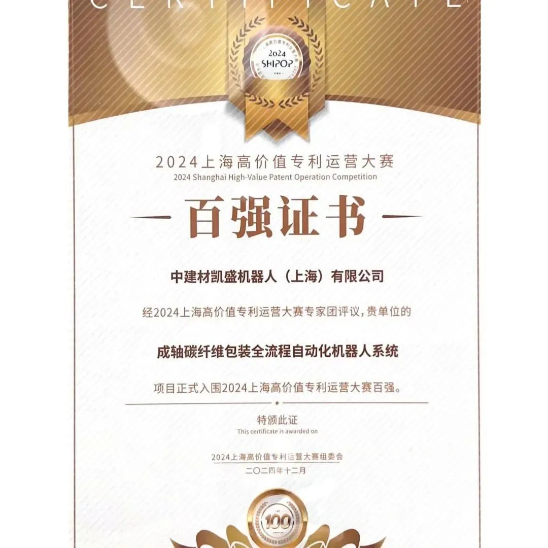 近日,凯盛机器人凭借“成轴碳纤维包装全流程自动化机器人系统”入围2024上海高价值专利运营大赛百强,这是对企业科技创新能力提升的充分肯定和知识产权工作成果的高度认可。