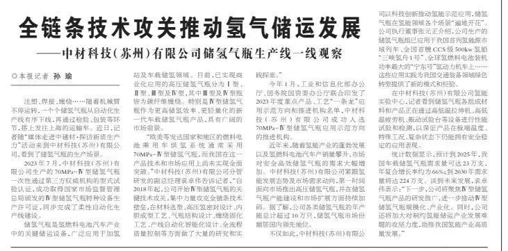 今年1月,工业和信息化部办公厅、国务院国资委办公厅联合印发了2023年度重点产品、工艺“一条龙”应用示范方向和推进机构名单,中材科技(苏州)有限公司成功入选70MPa-Ⅳ型储氢气瓶应用示范方向的推进机构。
