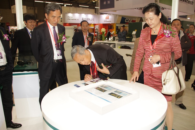 中国建材联合会名誉会长张人为,中国建材联合会副会长、中国硅酸盐学会理事长徐永模,中国建材联合会副会长、中国建筑玻璃与工业玻璃协会会长陈国庆,中国硅酸盐学会秘书长晋占平以及国际玻璃企业友人,在 副董事长、中国建材总院院长姚燕和凯盛集团总经理彭寿的陪同下参观了总院、凯盛集团等企业的展台。