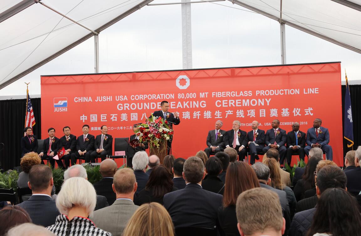 美国当地时间12月8日中午11时28分(北京时间12月9日0点28分),中国巨石投资美国3亿美元建设8万吨玻璃纤维生产线项目在美国南卡罗来纳州里奇兰县正式奠基。 总经理曹江林,中国巨石总裁、巨石集团董事长兼首席执行官张毓强,中国驻美国使馆经济商务公使朱洪,美国南卡罗来纳州副州长亨利·麦克马斯特、商务厅厅长鲍比·希特,里奇兰县议会主席托里·拉什出席仪式并致辞。美国南卡罗来纳州商务厅全球业务发展部主任纳尔逊·林赛,里奇兰县经济发展委员会主席保罗·利文斯顿,哥伦比亚市市长史蒂夫·本杰明,中国巨石股东、监事唐兴华,中国巨石副总裁、巨石集团总裁杨国明,中国巨石副总裁曹国荣、项茹冰参加奠基仪式。杨国明主持奠基仪式。
