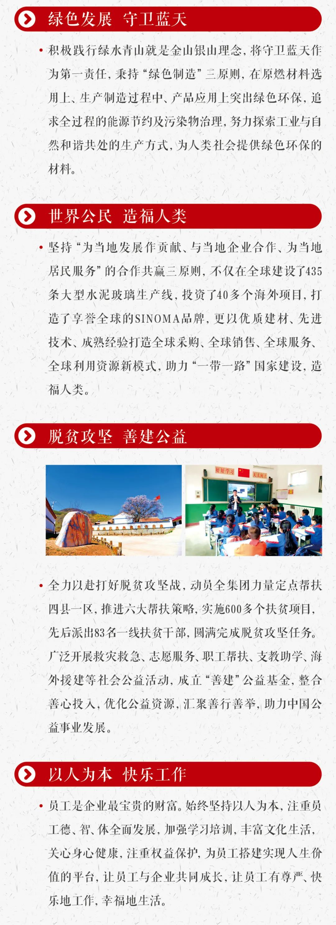 同时文化建设关乎企业发展和每位员工自身的幸福感。我们都是企业文化的亲历者、感受者,希望大家深度挖掘发生在身边的文化故事,写下你正在经历的与中国建材的不解之缘,表达你所充分认同和愿意付出的点点滴滴,巩固提升我们共同的文化成果。